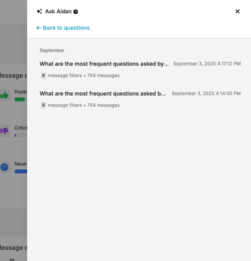From the 'Messages' section, the bottom button is also displayed to trigger it. Note that questions and answers will be based on the time frame and filters you have selected. On this page, the 'keyword search' functions as a filter. You can look for specific keywords to ask questions based on the results you will have to tackle specific use cases.